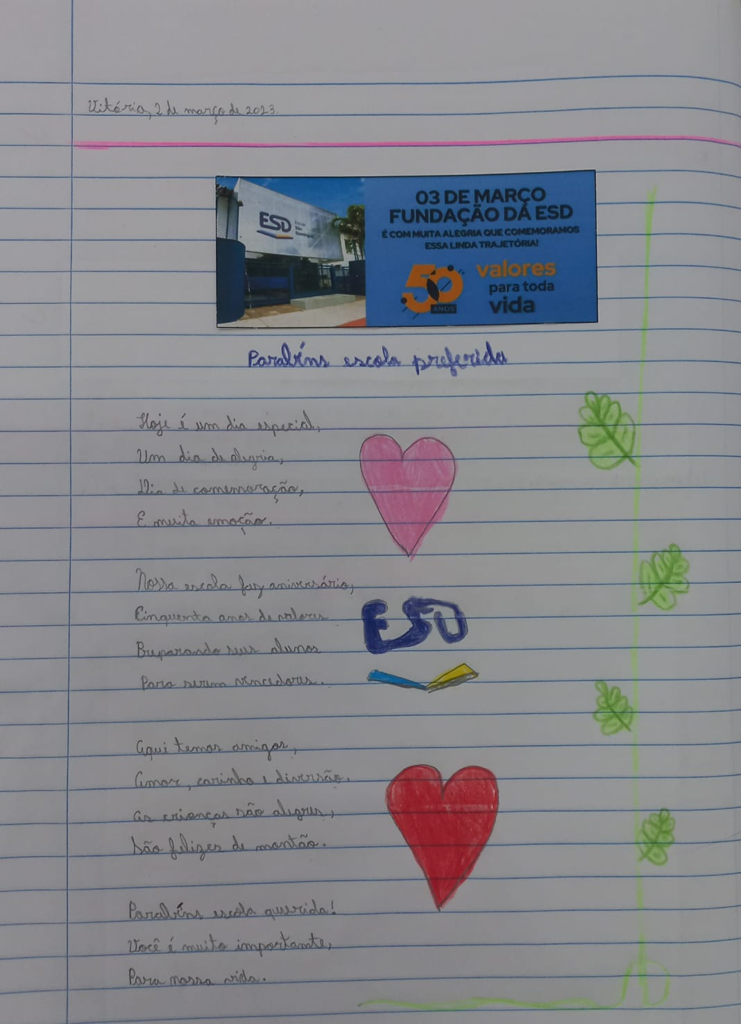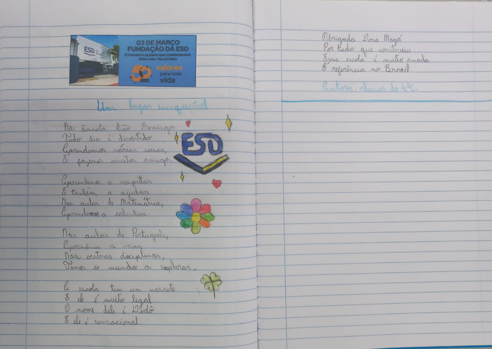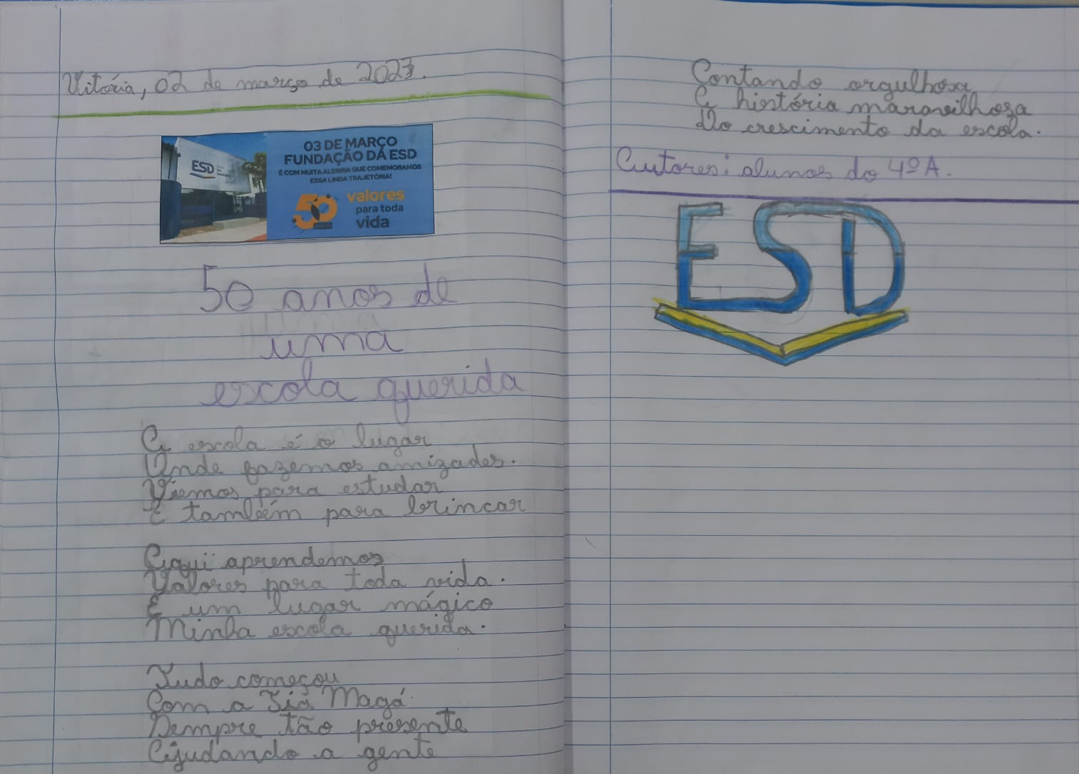 A Escola São Domingos completou o seu cinquentenário e os alunos do 4° ano decidiram presentear a instituição com lindos poemas. Cada uma das três turmas redigiu seu próprio texto, falando sobre a alegria, o aprendizado, e os valores da ESD.