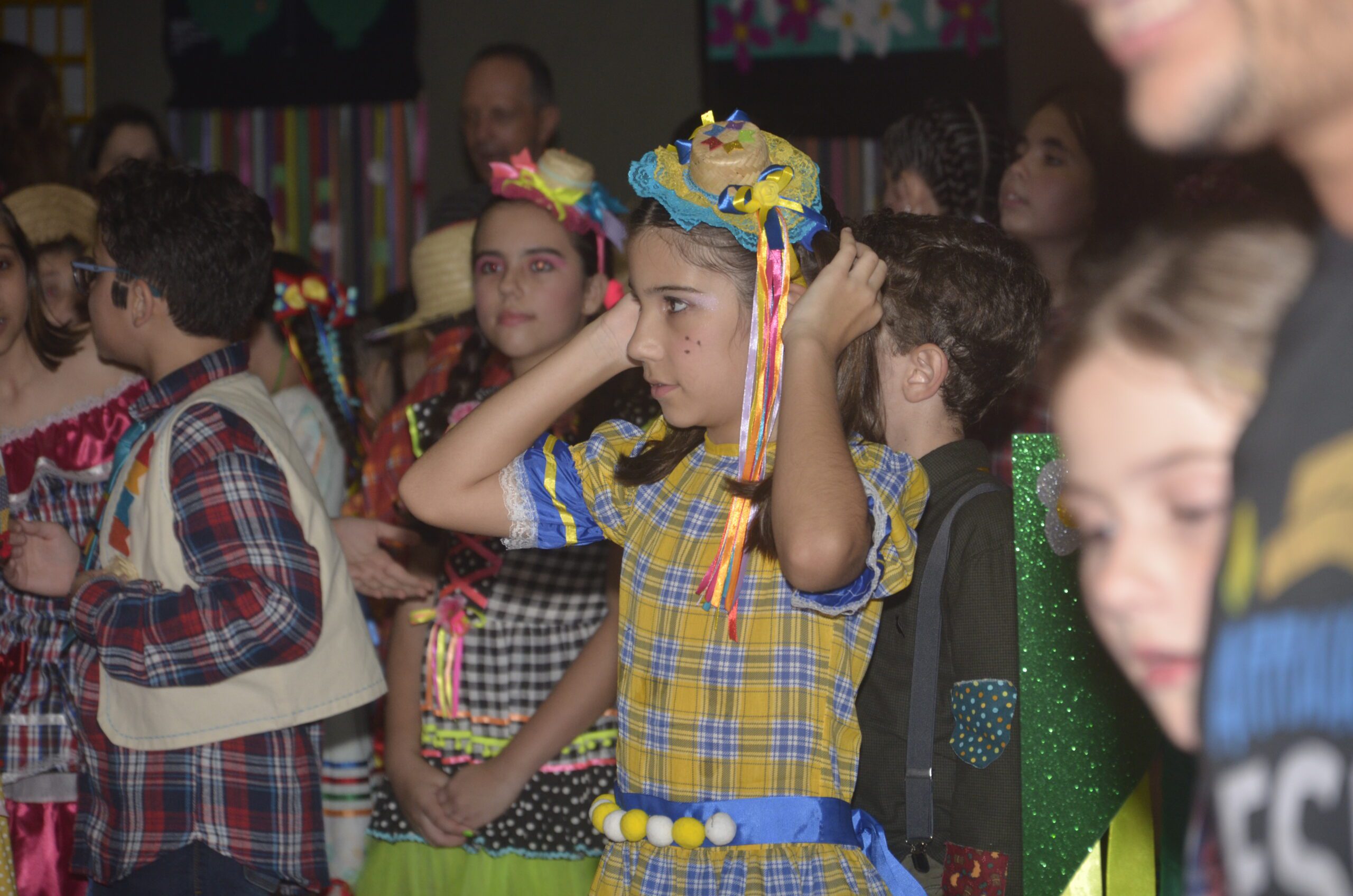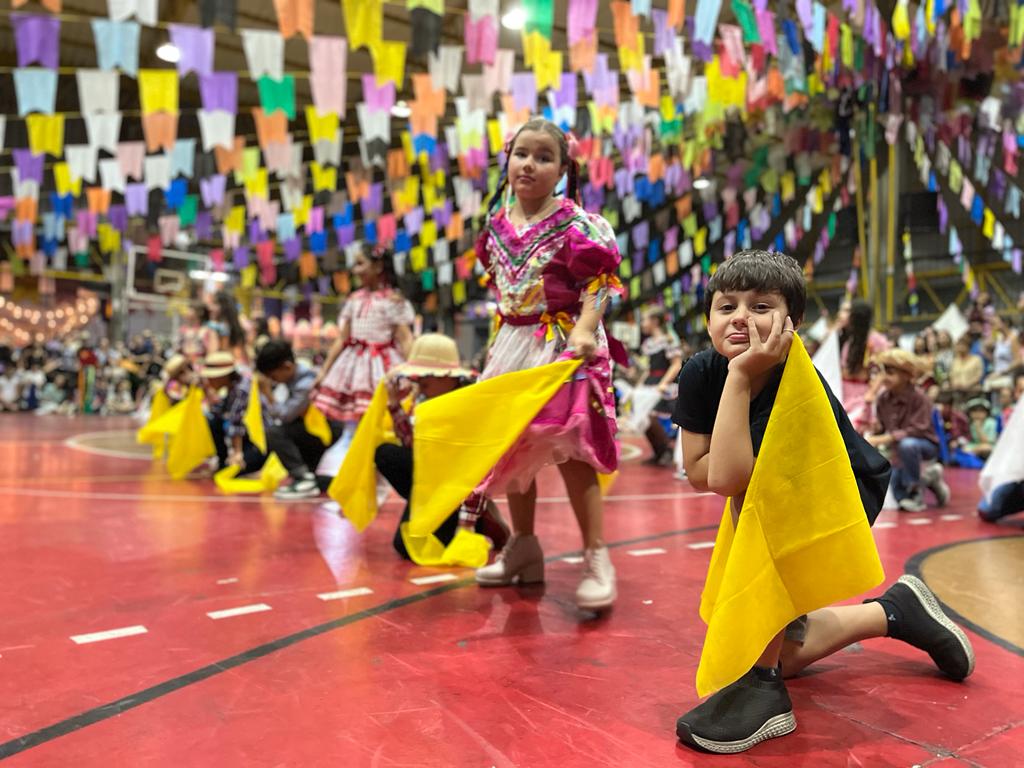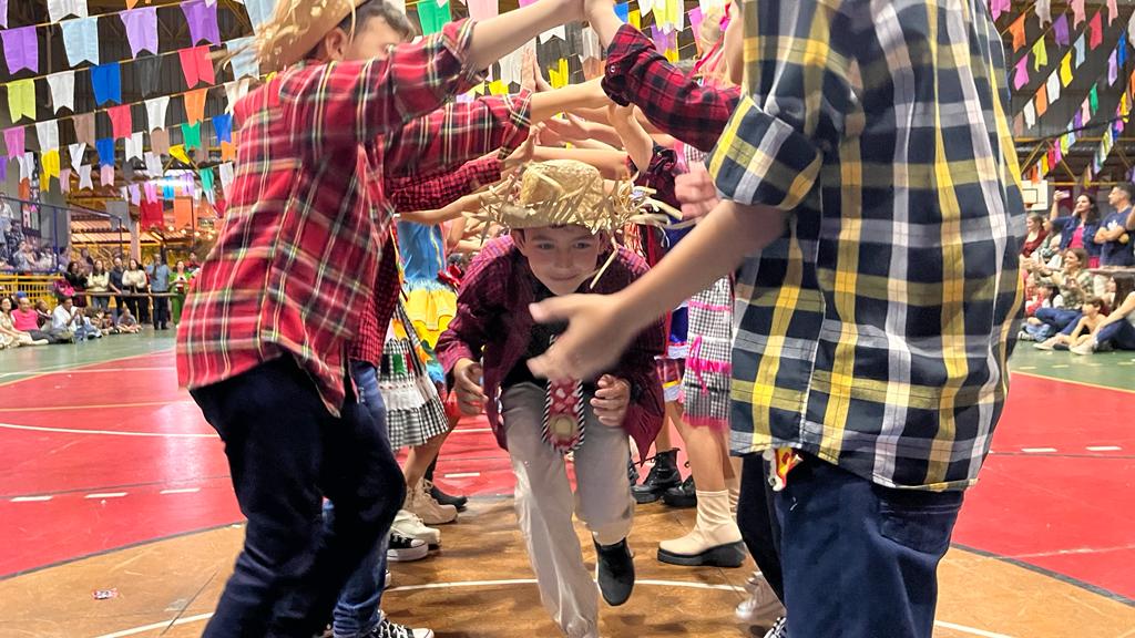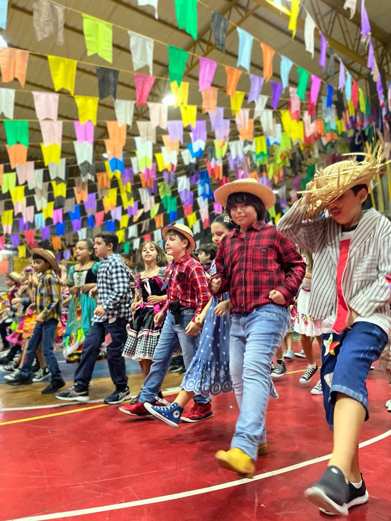 Os pequenos dançarinos apresentaram coreografias típicas, demonstrando dedicação e entrosamento durante suas performances. A energia contagiante da música e das danças juninas envolveu a todos.